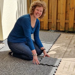 Plattorna är lätta, snabba och enkla att lägga – även för lekmän. De ger en fantastisk gångyta, även barfota. Materialet hade hos oss bara en svag lukt några timmar, varefter den försvann. Slutsats: Vi har nu en superterrass. 100 % rekommendation.
