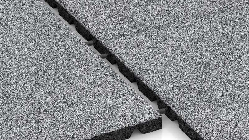 Mattan tillverkas av PU-bundet gummigranulat. Den öppna, halksäkra ytan ger god stabilitet även i vått väder. Materialet är ljuddämpande, frostbeständigt och behagligt att röra vid. Undersidan är kraftigt profilerad med inverterade pyramidformer, vilket ger effektiv stötdämpning, god vattenavrinning och snabb torkning.