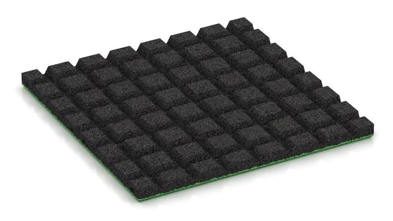 Mattan tillverkas av PU-bundet gummigranulat. Den öppna, halksäkra ytan ger god stabilitet även i vått väder. Materialet är ljuddämpande, frostbeständigt och behagligt att röra vid. Undersidan är kraftigt profilerad med inverterade pyramidformer, vilket ger effektiv stötdämpning, god vattenavrinning och snabb torkning.