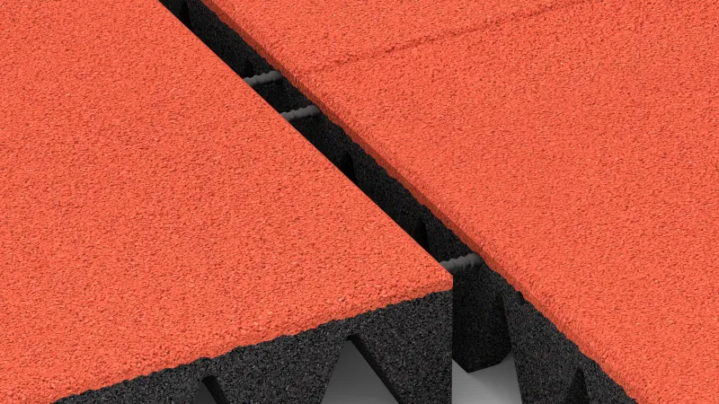 Undersidan är strukturerad med regelbundet placerade, omvända pyramidstommar. Denna geometri förbättrar stötdämpningen och möjliggör horisontell avrinning av regnvatten. Vattnet passerar genom mattan och leds bort under ytan längs markens naturliga lutning. Pölar undviks effektivt.