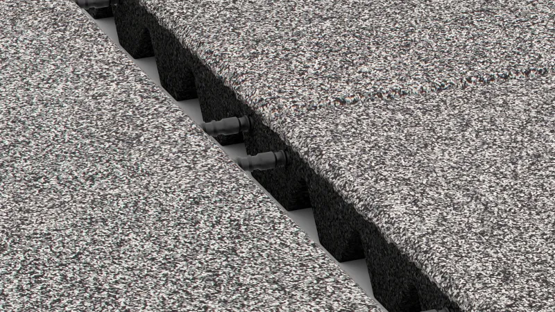 För utomhusbruk rekommenderar WARCO ett fast och vattenpermeabelt underlag. Beprövade lösningar är plastbaserade cellplastnät (t.ex. grusmattor) eller ett bundet, dränerande underlag som dräneringsbetong. Om underlaget inte är genomsläppligt krävs ett fall på minst 1,5 % för att säkerställa avrinning. Det är inte lämpligt att lägga på löst material som sand, grus eller stenkross – dessa förflyttas lätt under elastiska plattor.