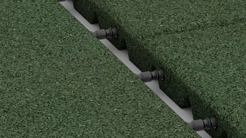 För utomhusbruk rekommenderar WARCO ett fast och vattenpermeabelt underlag. Beprövade lösningar är plastbaserade cellplastnät (t.ex. grusmattor) eller ett bundet, dränerande underlag som dräneringsbetong. Om underlaget inte är genomsläppligt krävs ett fall på minst 1,5 % för att säkerställa avrinning. Det är inte lämpligt att lägga på löst material som sand, grus eller stenkross – dessa förflyttas lätt under elastiska plattor.