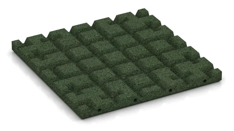 Plattorna tillverkas av PU-bundet gummigranulat med en elastisk, halksäker yta. Tjocklek och densitet avgör stötdämpningen och den certifierade fallhöjden enligt EN 1177. Formatet 50 × 50 cm minimerar spill vid kapning och gör det enkelt att byta ut enskilda plattor vid behov.