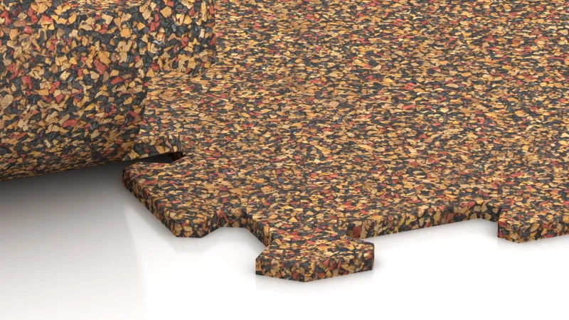 Plattorna tillverkas genom att överdimensionerade block av PU-bundet ELT-gummigranulat produceras och efter en mognads- och kylfas delas mitt itu. Resultatet är särskilt tunna fitnessplattor med en typisk gummiyta som upplevs nästan sluten och därmed förhindrar att smuts och fukt tränger in.