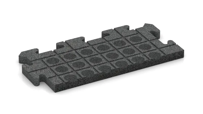 Kantplattan säkerställer en ren och rak avslutning längs ytterkanterna på en belagd yta. Varje enhet motsvarar en halv pusselplatta: insidan har det välkända pussellåset och passar perfekt ihop med de övriga plattorna, medan utsidan bildar en slät, rak avslutningskant. På så sätt får hela ytan en funktionell och visuellt tilltalande inramning.