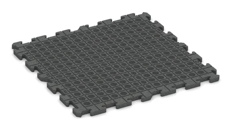 Två sidor har ett positivt tandmönster, de andra två ett negativt. När plattorna läggs hakar de fast underifrån och skapar en stark, varaktig förbindelse. Uppifrån får ytan ett jämnt, fogbundet utseende med symmetrisk struktur – ofta i form av ett schackrutigt mönster.